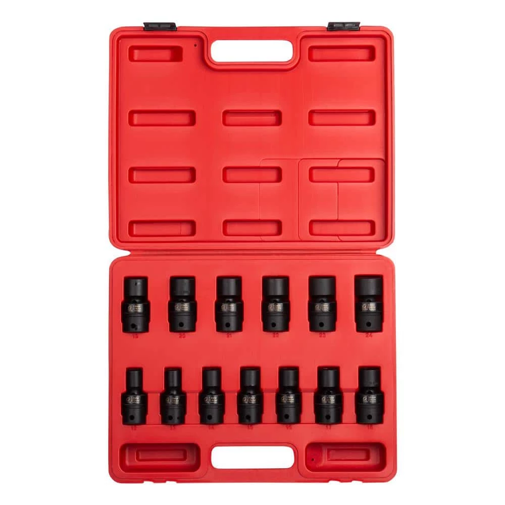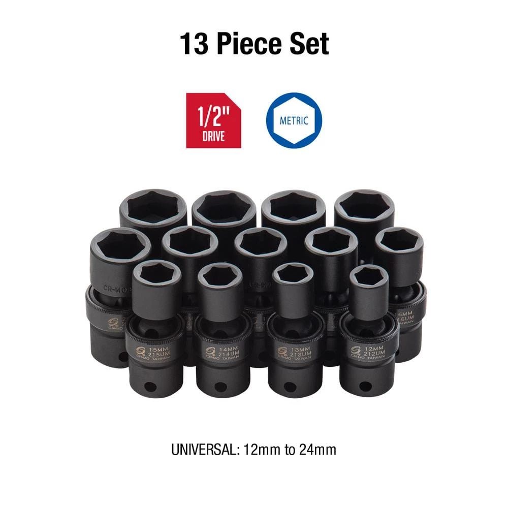 Use the best tools for every job with the Sunex 26651/2 in. Drive Universal Impact Socket Set. Each socket is forged from Cr-Mo alloy steel, designed with radius corners, made with chamfered openings, and marked by laser etching and roll stamping for permanent socket identification. The set includes metric sizes from 12 mm to 24 mm in universal lengths. These sockets meet ANSI Standards and the set is backed by a lifetime warranty. Includes a heavy-duty storage case.