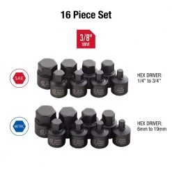 The Sunex 3841 ? in. Drive Pipe Plug Socket Set includes SAE sizes from 3/16 in. to 3/8 in. Each socket has been forged from high grade Cr-Mo steel, constructed as a solid one piece, and marked by both laser etching and roll stamping to ensure permanent socket identification. All of this ensures our sockets’ professional-level performance–conveniently stored in one heavy duty storage case. Meets ANSI Standards.