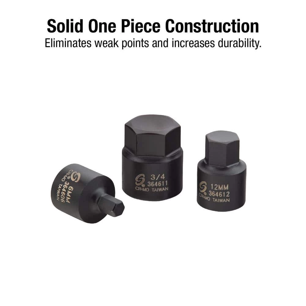 The Sunex 3646 3/8 in. Drive Low Profile Impact Hex Driver Set includes SAE sizes from ¼ in. to ¾ in. and metric sizes from 6mm to 19mm. Each driver has been forged from high grade Cr-Mo steel, constructed as a solid one piece, and marked by both laser etching and roll stamping to ensure permanent socket identification. All of this ensures our drivers’ professional-level performance–conveniently stored in one heavy duty storage case. Meets ANSI Standards.