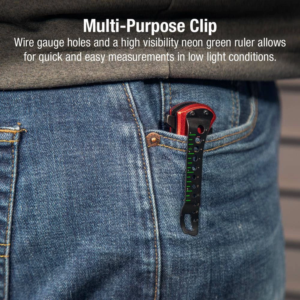 - Multi-purpose clip: wire gauge holes and a high visibility neon green ruler allows for quick and easy measurements in low light conditions