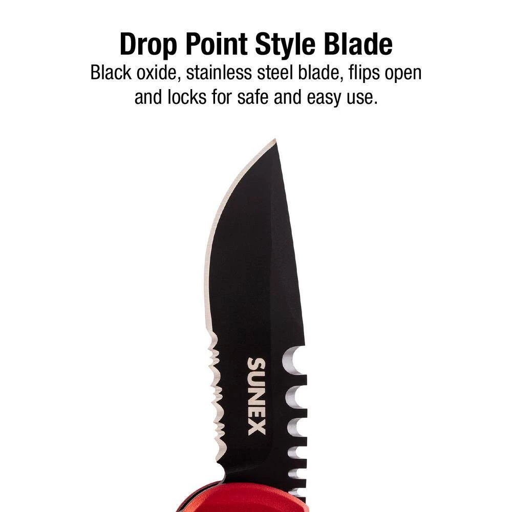 - Drop point style blade: black oxide, stainless steel blade, flips open and locks for safe and easy use