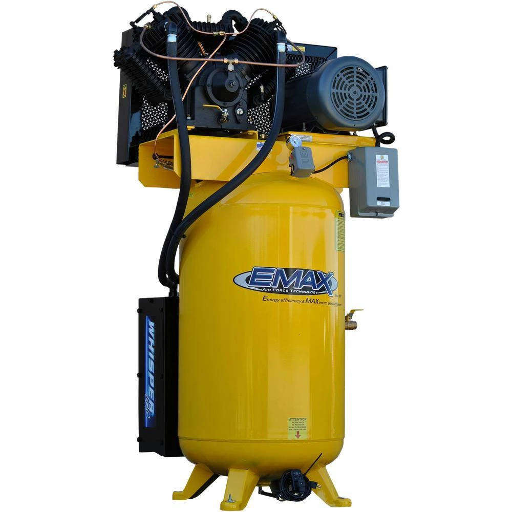 EMAX Compressor Tools and Equipment deliver overwhelming performance to ensure that they meet the needs of even the most demanding environments. All products are designed with exacting tolerance and specifications to deliver all the power that is needed at the Jobsite, Garage or Shop for extreme performance. All EMAX piston pumps deliver big air and include steel connecting rods and removable disc valves. Air Stream Technology insures you will have the coolest, quietest air compressor in the industry. It includes an air compressor silencer that is designed to suppress operating noise level and also acts as a filtration system to prevent foreign matter from entering the intake. The EMAX Silent Air Industrial Air Compressor offers super-quiet low RPM with solid cast iron construction for extended life. The EMAX Compressor with built on Whisper 100 is an affordable solution to your piston compressor noise problem. The Whisper 100 dissipates compressor intake noise by channeling the intake air through a series of baffle plates and pre-filter media within the silencer cabinet. As a result, the piston intake noise is trapped and dissipated within the silencer structure. The compressor intake filters are also located inside the Whisper 100-cabinet which further enhances noise reduction. The Whisper 100 noise suppression system is compact in design and is located on the back of the compressor tank. Plumbing intake air transfer hoses from the compressor head/heads to the silencer.