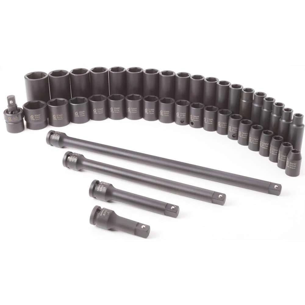 This is a Metric Impact Socket Set with 43 Pieces. Most complete 1/2 in. metric impact socket master set on the market. Full complement of extensions provides user with access to virtually all recessed fasteners.
