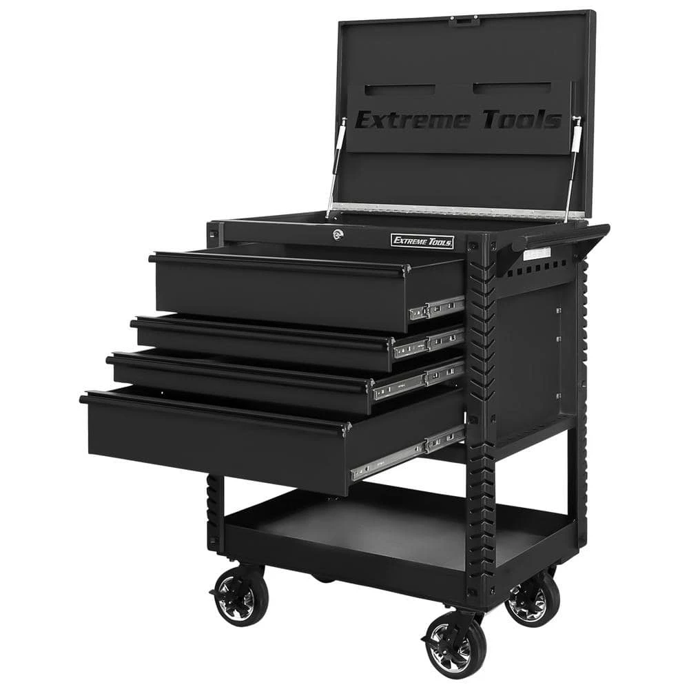 Extreme Tools EX Professional Series 33″ 4 Drawer Deluxe Tool Cart is a heavy-duty professional cart which will hold up through extended use. The most unique feature of this tool cart is the top storage compartment. Open the lid, and you can access all your tools in the top drawer as well as tool hangers/holders on the sides of the cart. The closed lid securely holds a PVC coated MDF top creating a durable work surface and still allows access to the top drawer. It is the most versatile design you will find! Quick Release self-latching anodized extruded aluminum drawer pulls keep drawers closed until you are ready to open them. Heavy-duty ball bearing slides on the drawers are load-rated 100 lbs. per drawer. The cart’s corners are covered in tough, impact-resistant non-marking bumpers to protect the cart as well as objects around it. Four 6″ x 2″ Mag Wheel casters allow you to easily move the tool cart in your workspace. As an added bonus, we have included our Power Tool Rack accessory which hangs off the side of the tool cart and keeps your power tools within easy reach.