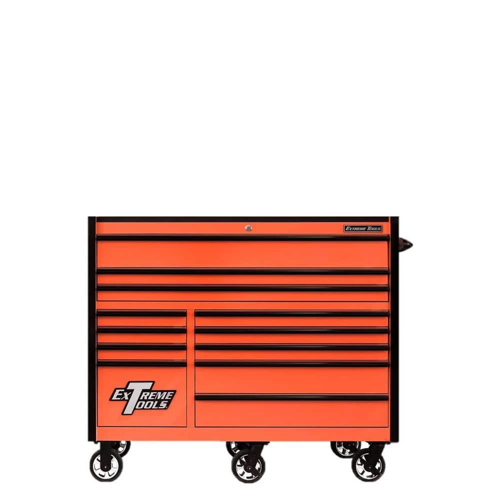 Extreme Tools RX Series RX552512RC-X 55″ 12-Drawer Roller Cabinet with 150 lbs. slides provides even more storage capacity than the standard series. This professional quality tool box features 3 extra long drawers with internal support to provide strength and prevent warping or twisting. Patented self-latching, Quick Release drawer pulls attach across the drawer front – not just at the ends – providing a sturdier, more secure handle and keep drawers closed. Each drawer uses full-extension ball bearing slides that let you load 150-300* lbs per drawer (*drawers with double slides.) Our exclusive Mag Wheel casters (load rated 900 lbs. each) and 14-gauge steel frame support a full-loaded box. This large roller cabinet gives you loads of space at an affordable price with the assurance of Extreme Tools quality.