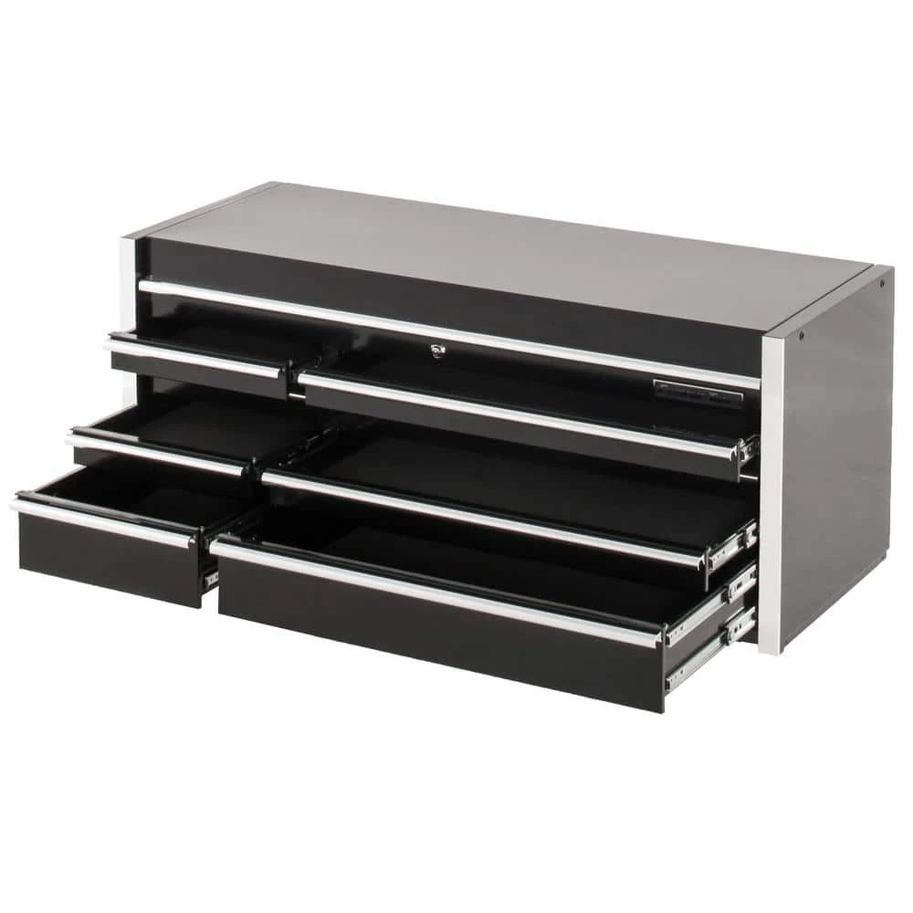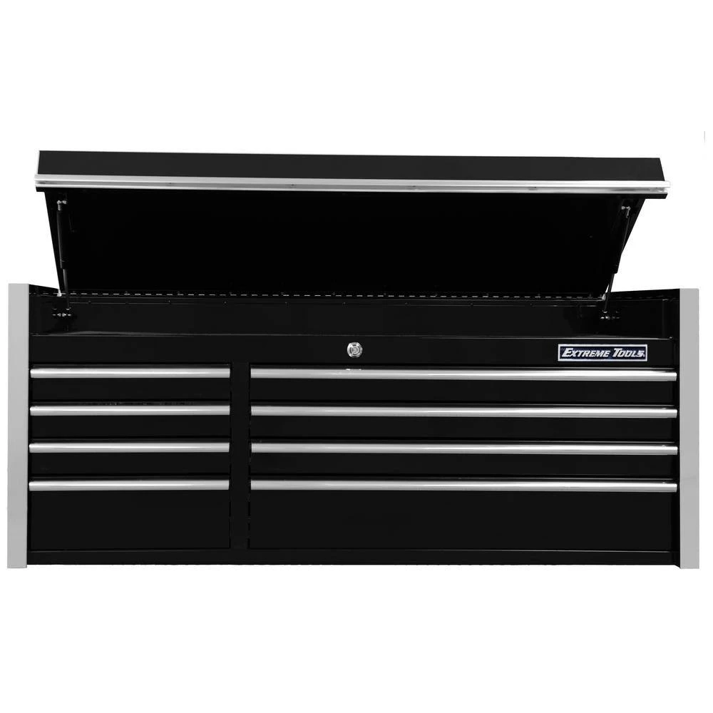 The Extreme Tools THD Series 55 in. Eight-Drawer Tool Chest in Black is an effective tool storage system. Excellent for heavy use, this Extreme Tools tool chest has an 18-gauge steel construction to offer increased durability. This tool storage system has an AkzoNobel high-gloss coat finish, which will protect against the elements and workshop accidents, such as spills. It has a lid that features gas struts, providing extra safety when opening and closing. It has eight drawers – four small and four large and features a total holding capacity of 12,255 cu. in., offering plenty of storage space for all your tools. Designed to accommodate heavy loads, this Extreme Tools high-quality tool chest features ball bearing slides that can hold up to 100 lbs., so you can easily access anything stored inside. This Extreme Tools tool chest is built with a tubular coded lock and key system to offer you peace of mind. Keep your workshop clutter-free with the Extreme Tools THD Series 55 in. Eight-Drawer Tool Chest in Black.