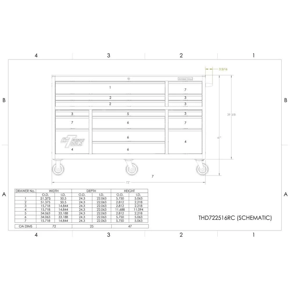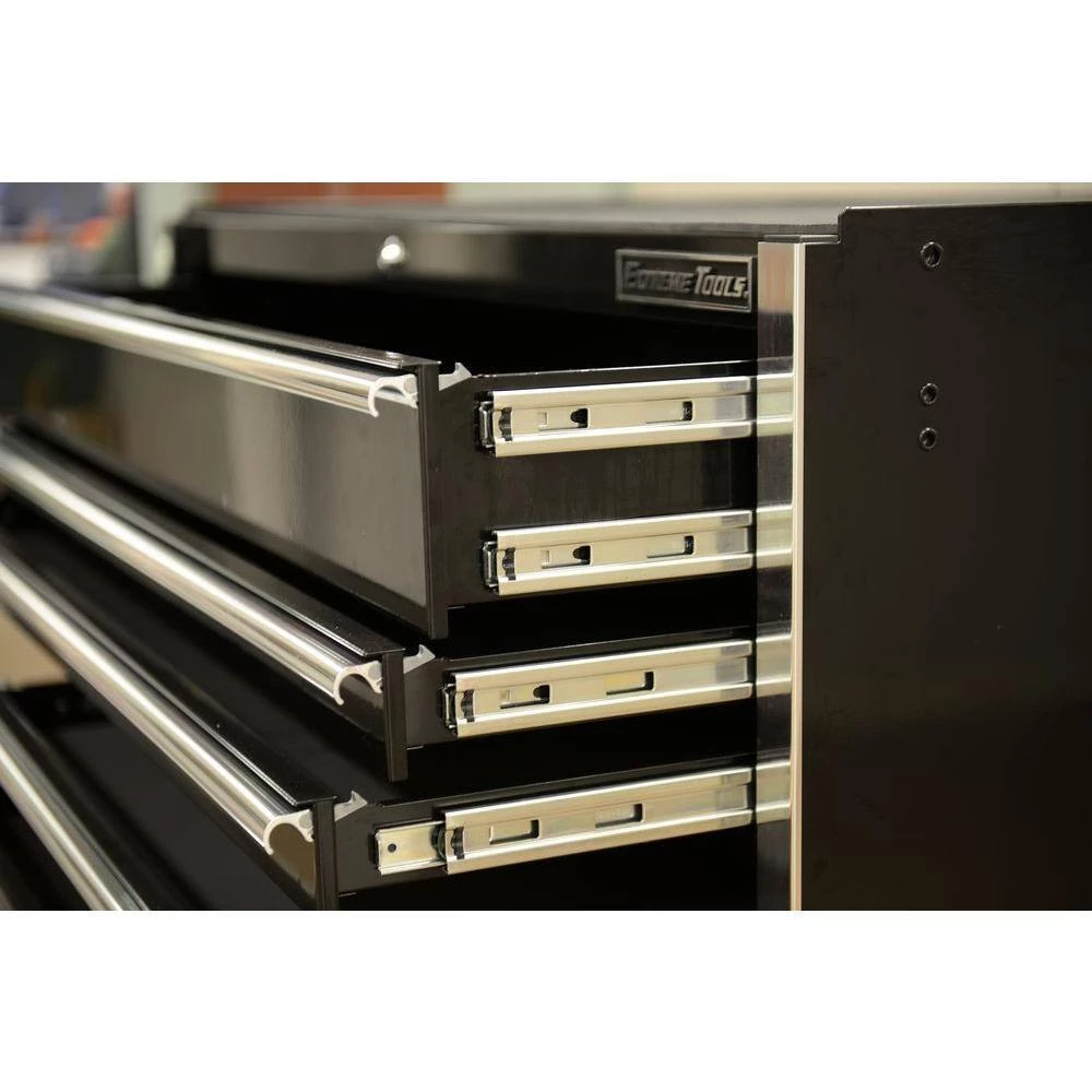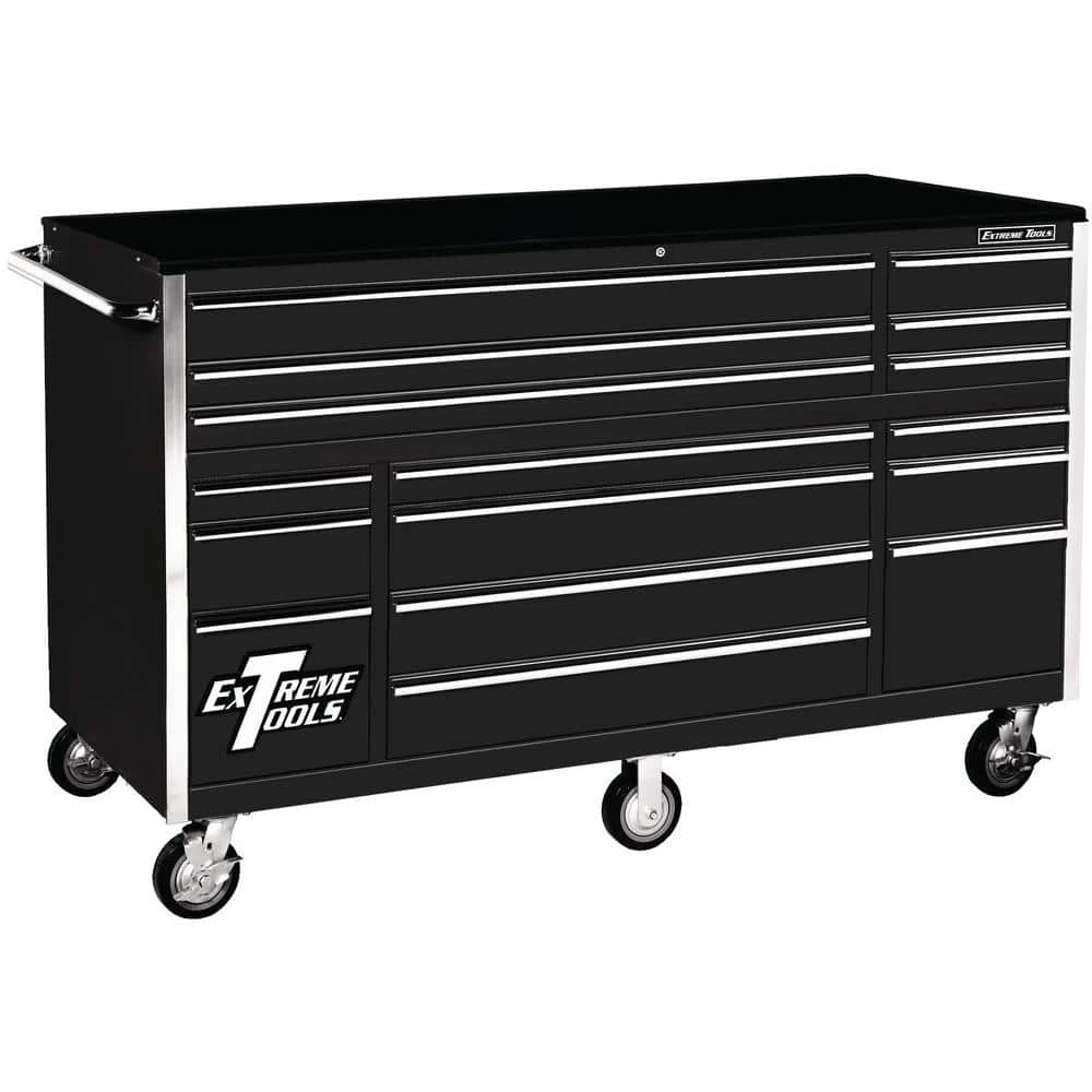 Keep your workshop clean with the Extreme Tools THD Series 72 in. 16-Drawer Roller Cabinet Tool Chest in Black. This high-quality tool chest features a portable design for convenient transportation. Perfect for heavy use, it has a 12-gauge steel construction to offer increased durability. This tool storage system has a high-gloss powder coating, designed to increase resistance to corrosion, weather and staining. It has 16 drawers – seven small, six medium and three large and features a total holding capacity of 35,367 cu. in., offering plenty of storage for all your hardware. Great for effortless closing and opening, it is made with ball bearing slides that can hold up to 100 lbs. to accommodate heavy loads. Designed to offer you peace of mind, this Extreme Tools tool chest is built with a tubular coded lock and key system, making it excellent for storing expensive tools. This roller cabinet tool chest features six casters and a chrome-plated handle for easily moving the unit. Redefine your tool and hardware organization with the Extreme Tools THD Series 72 in. 16-Drawer Roller Cabinet Tool Chest in Black.